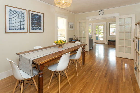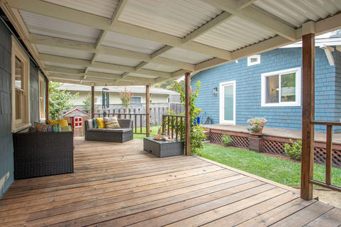 Classic vintage 1918 California bungalow with charming curb appeal and a cool retro bohemian vibe on a quiet, lovely street in the coveted flats of San Anselmo! A welcoming level lawn and inviting front porch evocative of simpler times beckons you to linger and enjoy refreshments with family, friends and neighbors. The 3 bedroom, 1 bath main house is reminiscent of a charming Cape Cod cottage with a freshly painted blue exterior accented by crisp white trim. Features of this warm and soulful home include a large living room and cozy brick fireplace with French doors that open to a spacious dining room with new handwoven bamboo pendant light fixture. Adjacent to the dining room is the light and bright kitchen that has been refreshed with newly painted abundant white cabinetry, black hardware, lighting and hip modern flooring. Chic mudroom with storage and washer/dryer included. Newer and vintage hardwood floors, new lighting, new flooring in bath, updated electrical and newer sewer lateral, furnace and roof. Plans for a second level by noted San Anselmo architect Jeff Kroot included. Perfect for indoor/outdoor living and entertaining with a deep, spacious level lot, all day sun, private covered redwood back deck and lovely grounds with decomposed granite pathways, native plantings, grassy lawn, bougainvillea, fruit trees including citrus, plum, and apricot and blueberry bushes, children's playhouse, and storage shed. Plenty of room for a vegetable garden and chicken coop too! Separate remodeled cedar shingled 2 room studio with full bath and concrete flooring is a cycling lover’s dream with ample bike storage and is perfect for working from home, indoor cycling/exercise/yoga/meditation studio, or distance learning center.